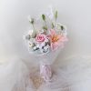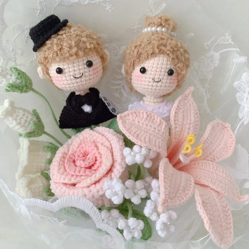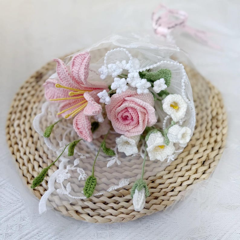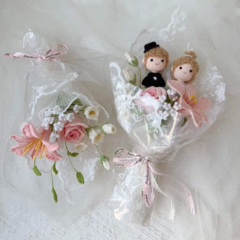 Bó hoa len móc cô dâu chú rể 30×20 cm, hồng trắng
