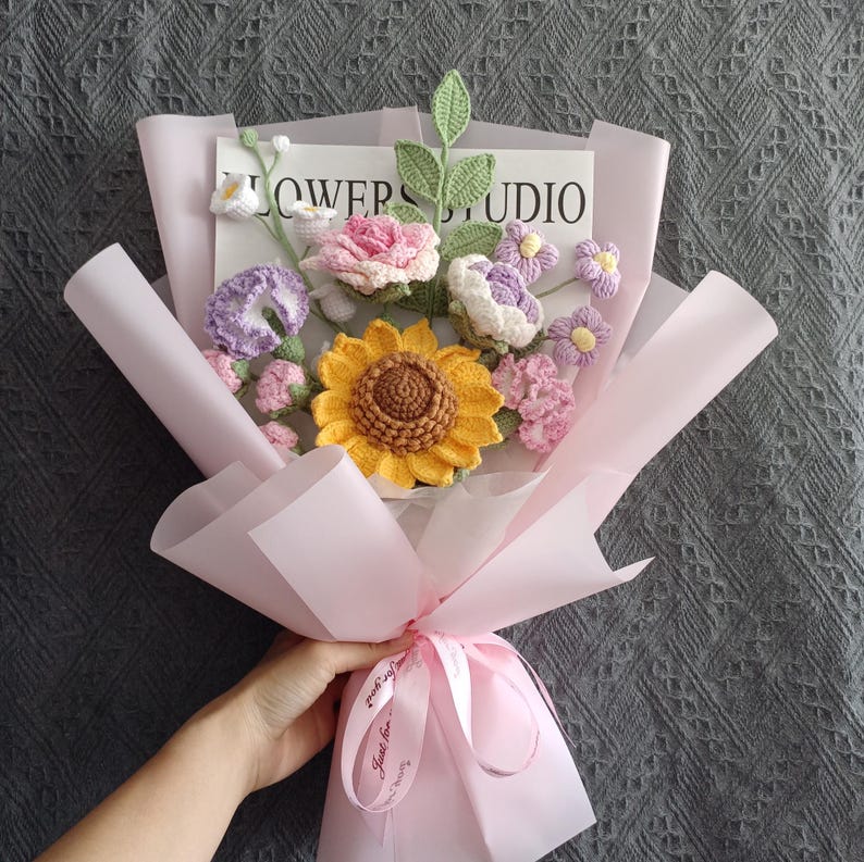 Trao tặng sự ngọt ngào bền lâu với bó hoa len móc hướng dương phối hồng, cẩm chướng và cúc pastel – vẻ đẹp không héo, dễ trang trí và lưu giữ kỷ niệm cho sinh nhật, kỷ niệm, Ngày của Mẹ hay “just because”. Bó hoa hoàn thiện, phối giấy gói hồng và nơ ruy băng, cầm gọn tay.