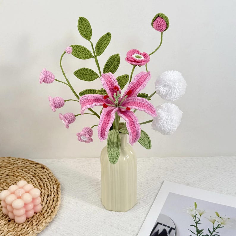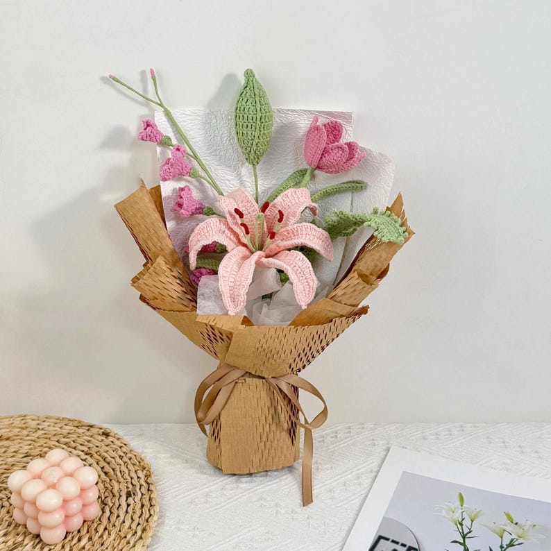 Tặng ngay sự dịu dàng bền lâu với bó hoa len móc lily hồng – điểm nhấn thủ công tinh xảo, không héo và dễ trang trí. Bó hoa gồm lily hồng làm trung tâm, phối nụ/hoa nhỏ trắng (gợi cảm hứng bồ công anh, lan chuông, freesia), gói giấy kraft mộc mạc, phù hợp sinh nhật, kỷ niệm hay trang trí góc làm việc.