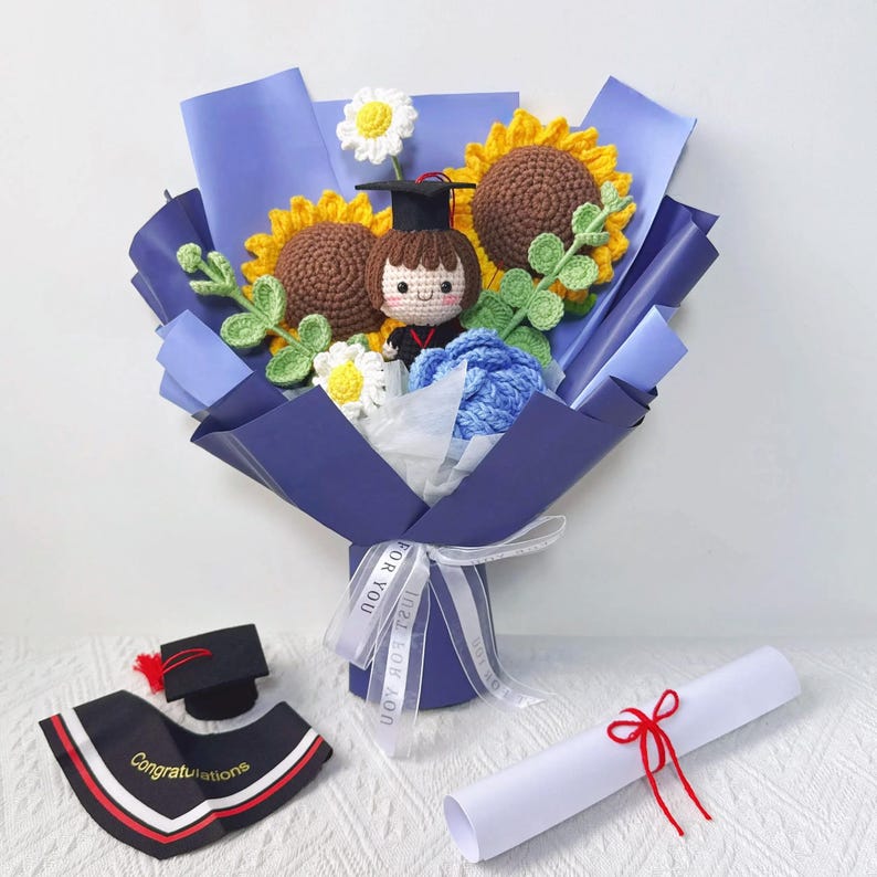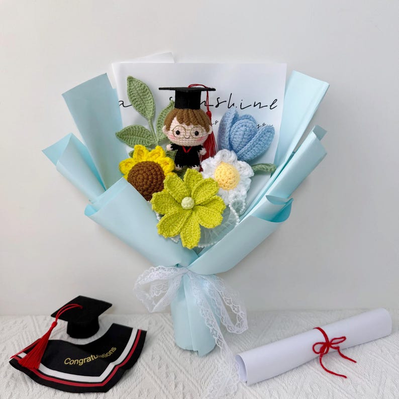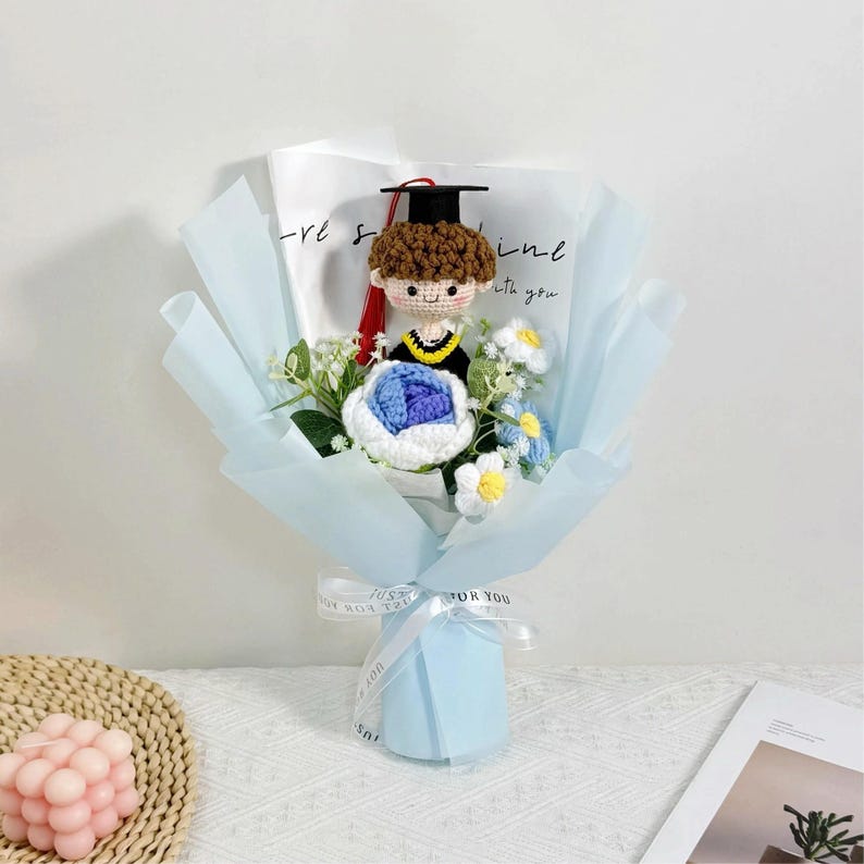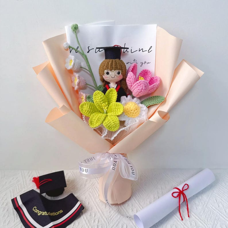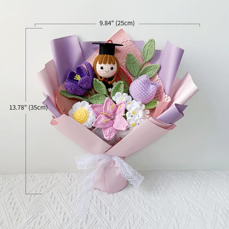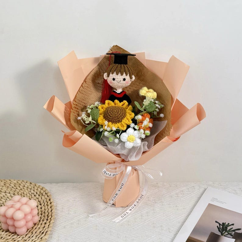 - Thành phần: 1 búp bê len tốt nghiệp (~15 cm) và bó hoa len phối nhiều loại.