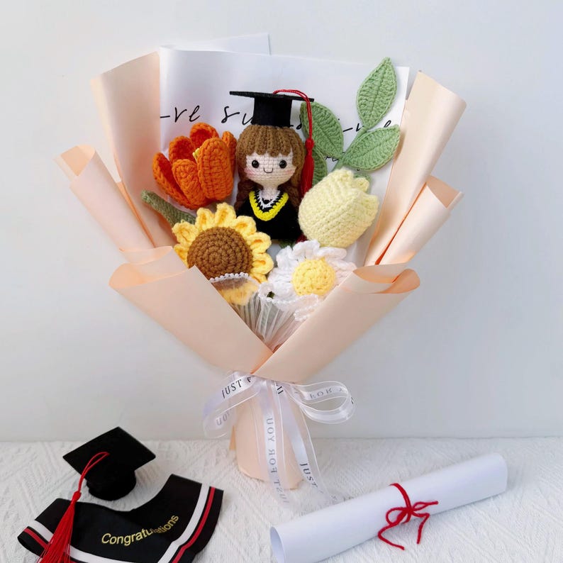 Tôn vinh thành tựu với bó hoa len móc tốt nghiệp bền đẹp, không héo và sẵn sàng trao tặng. Bó hoa phối lily hồng, cúc trắng–vàng, nụ tím và lá len, điểm nhấn là búp bê len đội mũ cử nhân – trang trí để bàn hay lưu niệm sau lễ.