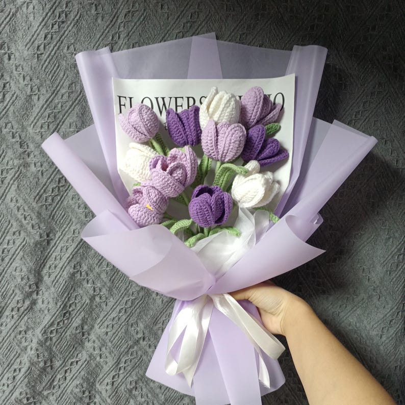 - Số lượng: 1 bó ~12 bông tulip móc tay kèm lá.