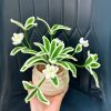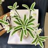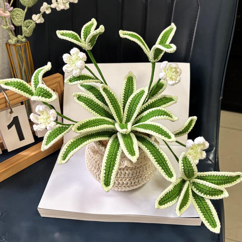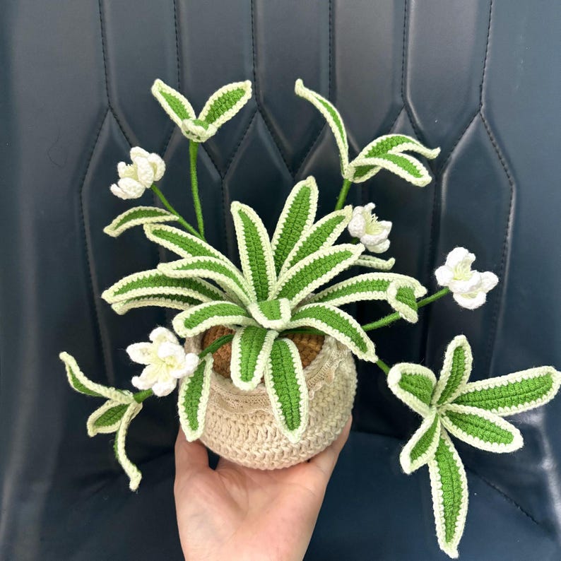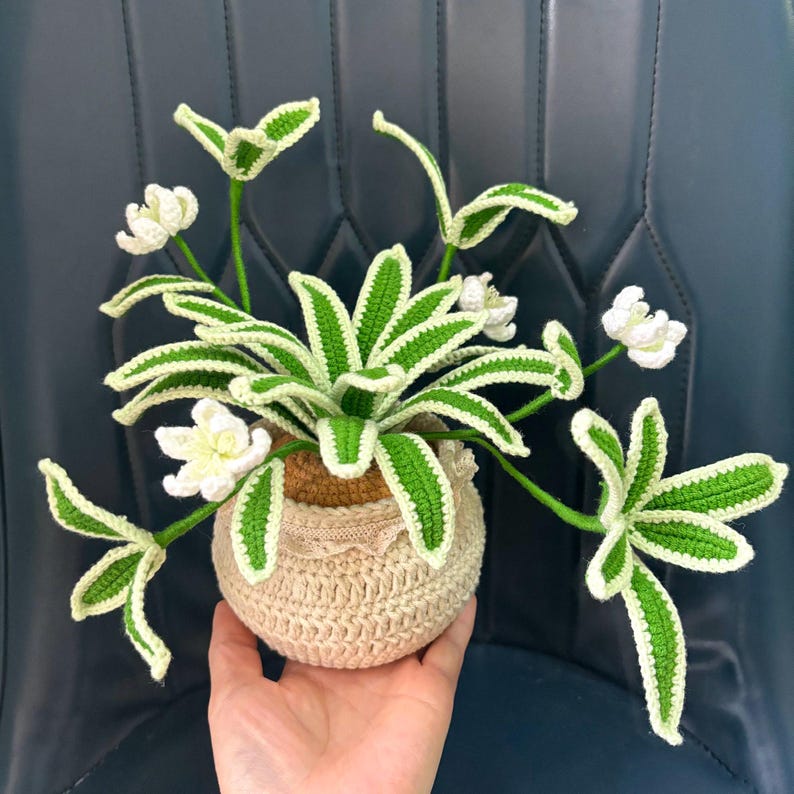 - Thiết kế sống động: Sản phẩm bao gồm cả chậu và cây, với những chiếc lá màu xanh viền kem và những bông hoa trắng nhỏ, được móc len một cách tỉ mỉ, tinh xảo.