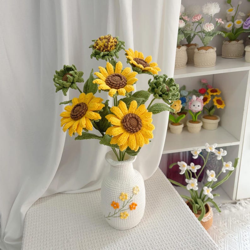 Mang vẻ đẹp trường tồn của mùa hè vào không gian sống của bạn với tác phẩm nghệ thuật đan móc độc đáo từ Knitwoolvn! Hoa hướng dương khổng lồ được làm thủ công tinh xảo, với chiều cao 45cm (17.7 inches), nở rộ trong chiếc bình gốm trắng tinh tế, tạo nên điểm nhấn ấn tượng cho bất kỳ không gian nào.