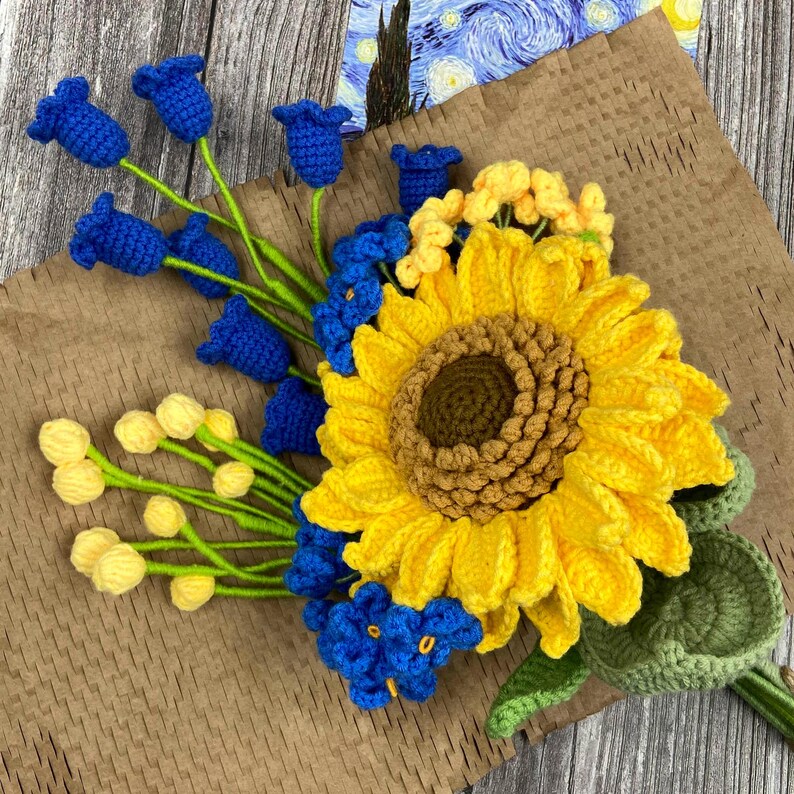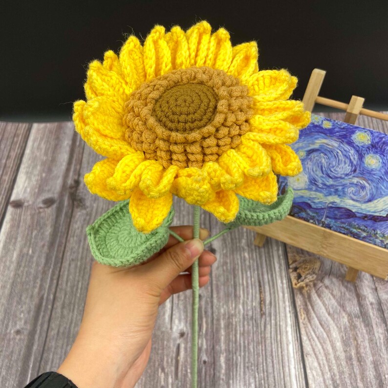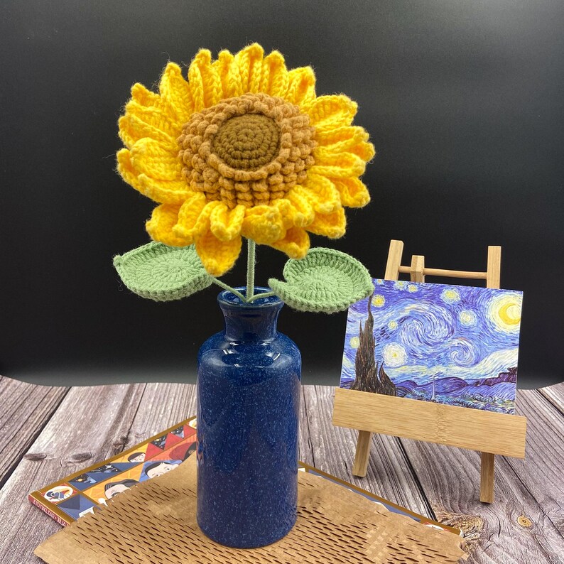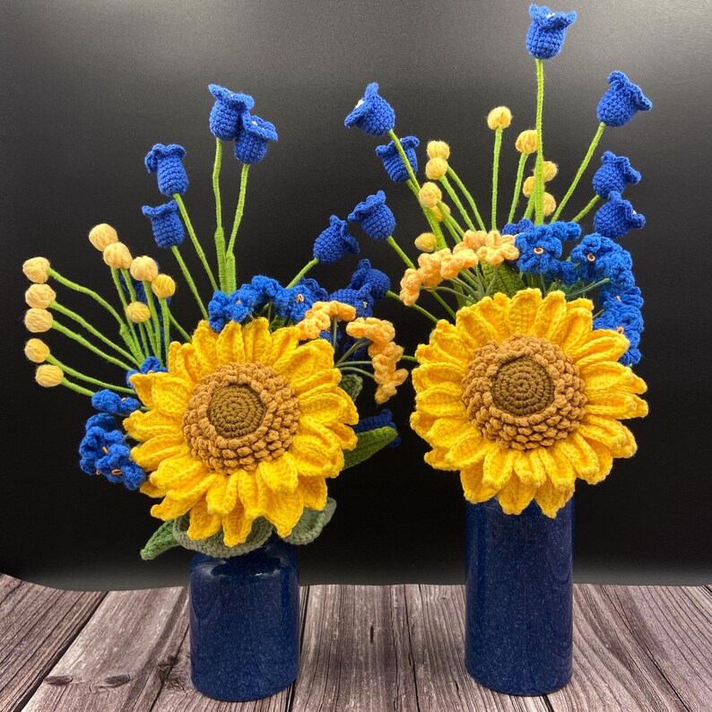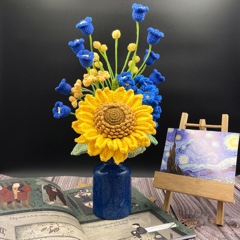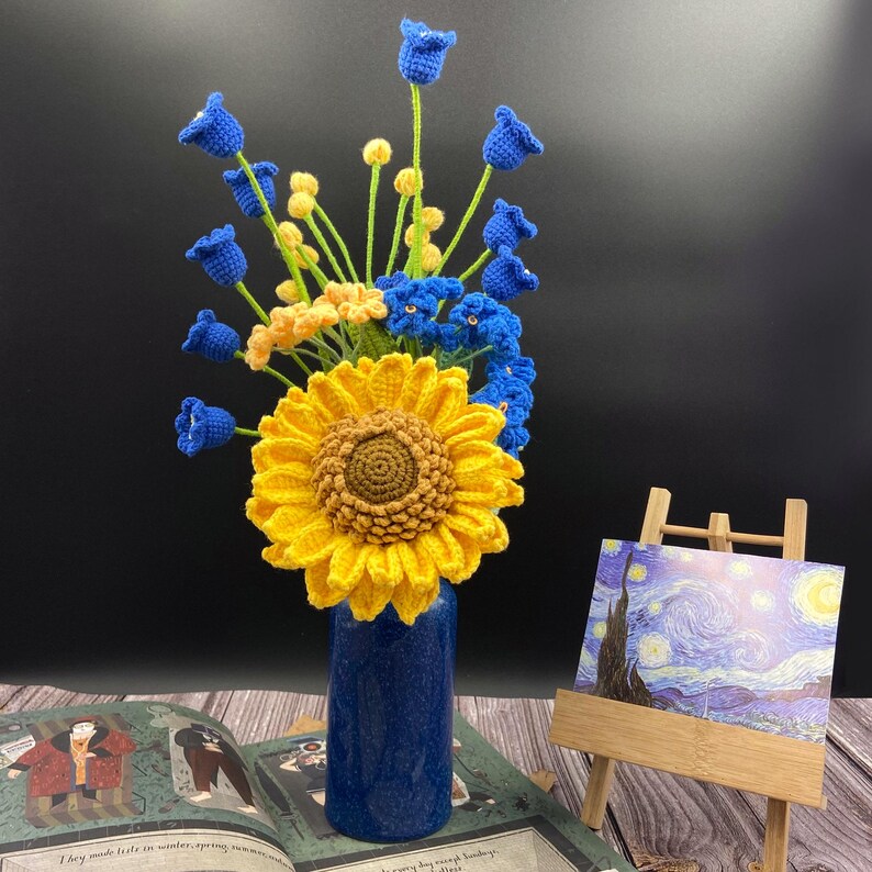 Mang đến niềm vui bất tận với bó hoa hướng dương len móc tay tuyệt đẹp từ Knitwoolvn! Cảm hứng từ bảng màu đêm đầy sao của Van Gogh, bó hoa này là một tác phẩm nghệ thuật thủ công tinh tế, rực rỡ sắc màu, hứa hẹn sẽ làm say đắm bất kỳ ai. Những bông hướng dương được móc tỉ mỉ, sống động như thật, tỏa sáng trong chiếc bình gốm xanh thanh lịch. Hình ảnh những bông hoa hướng dương tươi tắn, rạng rỡ như ánh mặt trời sẽ thổi một làn gió mới vào không gian sống của bạn.