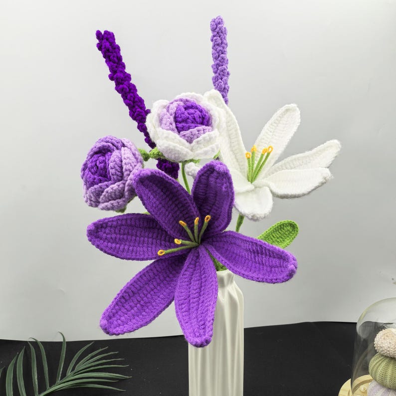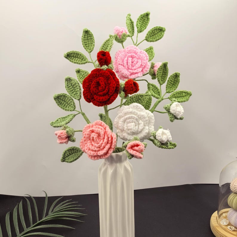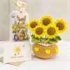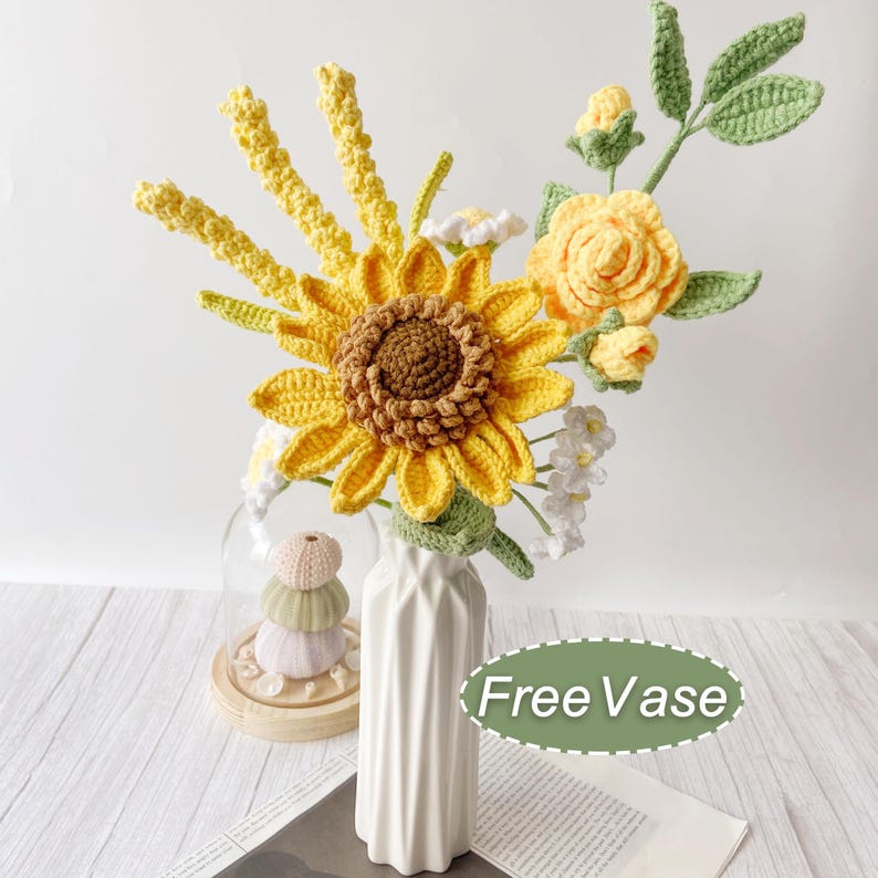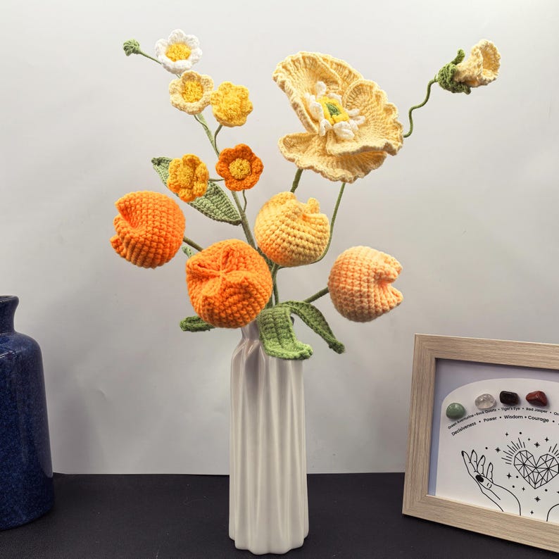 Những bông hoa móc len xinh xắn của Knitwoolvn sẽ mang đến một làn gió mới cho không gian sống của bạn. Từng cánh hoa được tạo nên từ sợi cotton mềm mại, tỉ mỉ khâu vá, tạo nên vẻ đẹp tinh tế và sống động như thật. Bó hoa gồm những bông hoa hướng dương rực rỡ, những đóa hồng kiêu sa, những bông lan thanh lịch và những bông tulip đáng yêu, tất cả được sắp xếp tinh tế trong một chiếc bình gốm nhỏ nhắn.